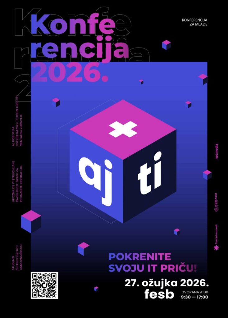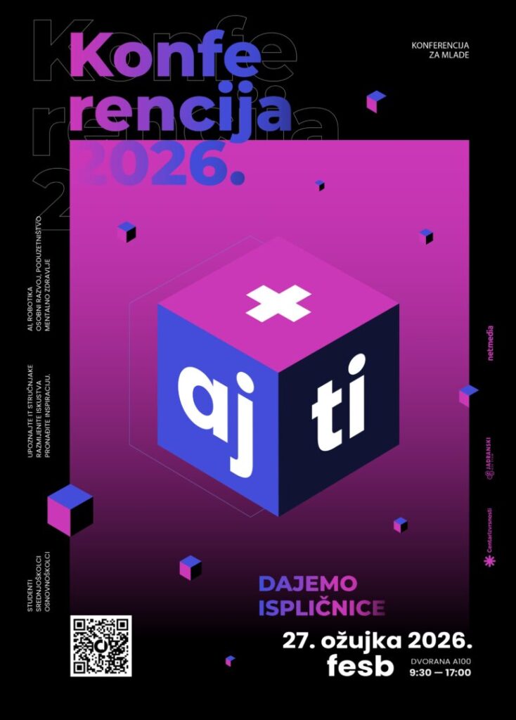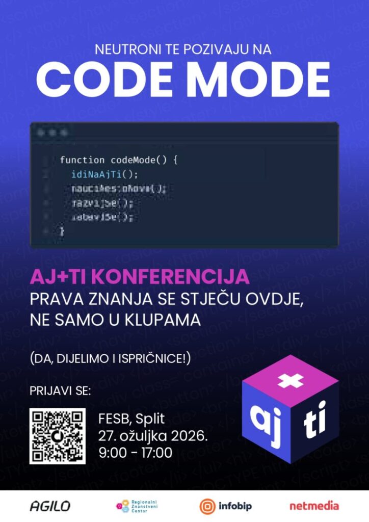 Treću Aj+Ti konferenciju za mlade, namijenjenu učenicima predmetne nastave i srednjoškolcima, 27. ožujka 2026. godine (petak) organizira Udruga Neutroni – Udruga za visokomotiviranu i darovitu mladež, u suradnji sa Splitsko-dalmatinskom županijom, Centrom izvrsnosti SDŽ i Regionalnim znanstvenim centrom, pod pokroviteljstvom Sveučilišta u Splitu i Fakulteta elektrotehnike, strojarstva i brodogradnje u Splitu (FESB). Konferencija će se održati na FESB-u u Splitu, u vremenu od 9:30 do 17:00 sati.