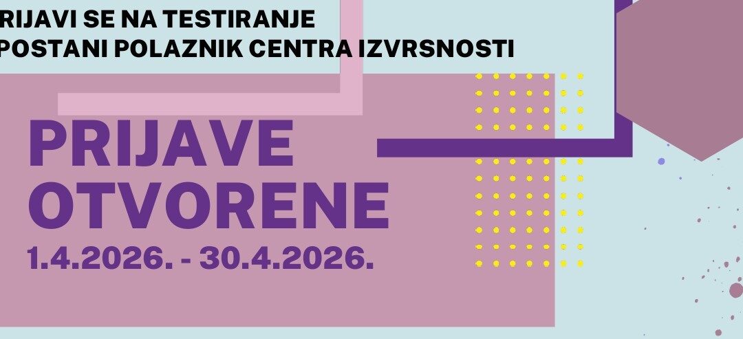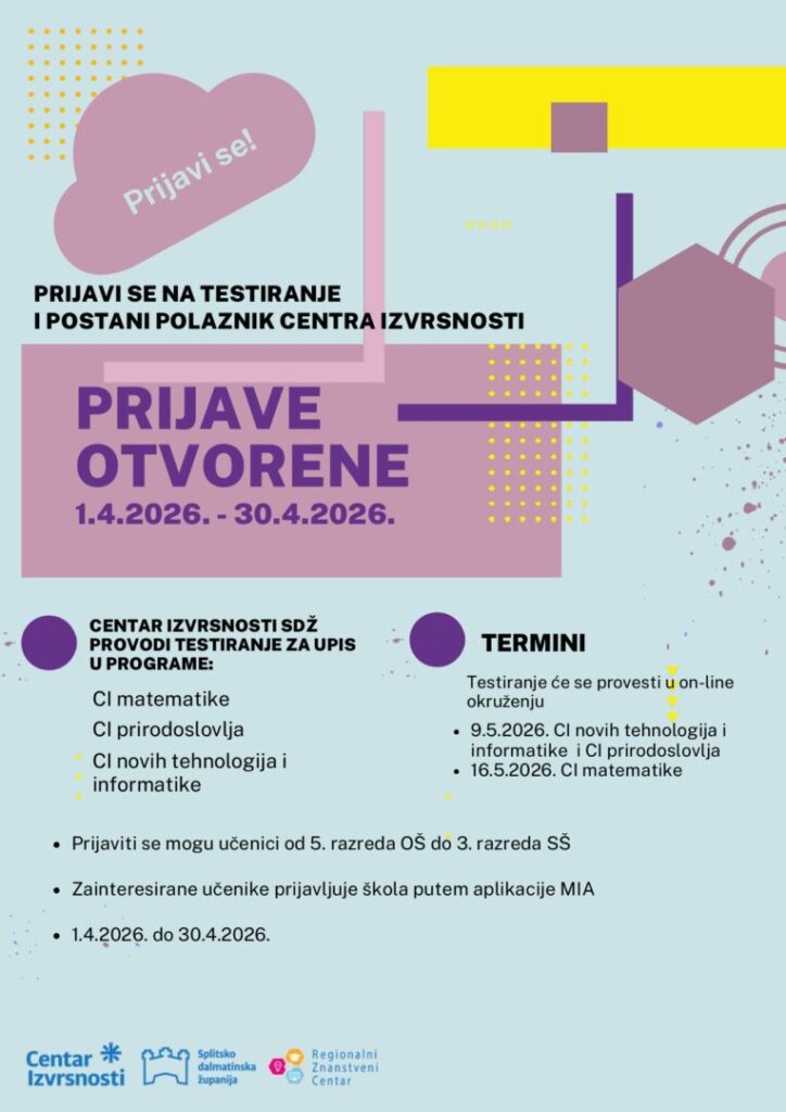 Prijave za testiranje za stjecanje statusa polaznika u izvanškolskim programima Centra izvrsnosti matematike, prirodoslovlja i novih tehnologija i informatike za školsku godinu 2026./2027.  su otvorene od 1. travnja 2026. do 30. travnja 2026.