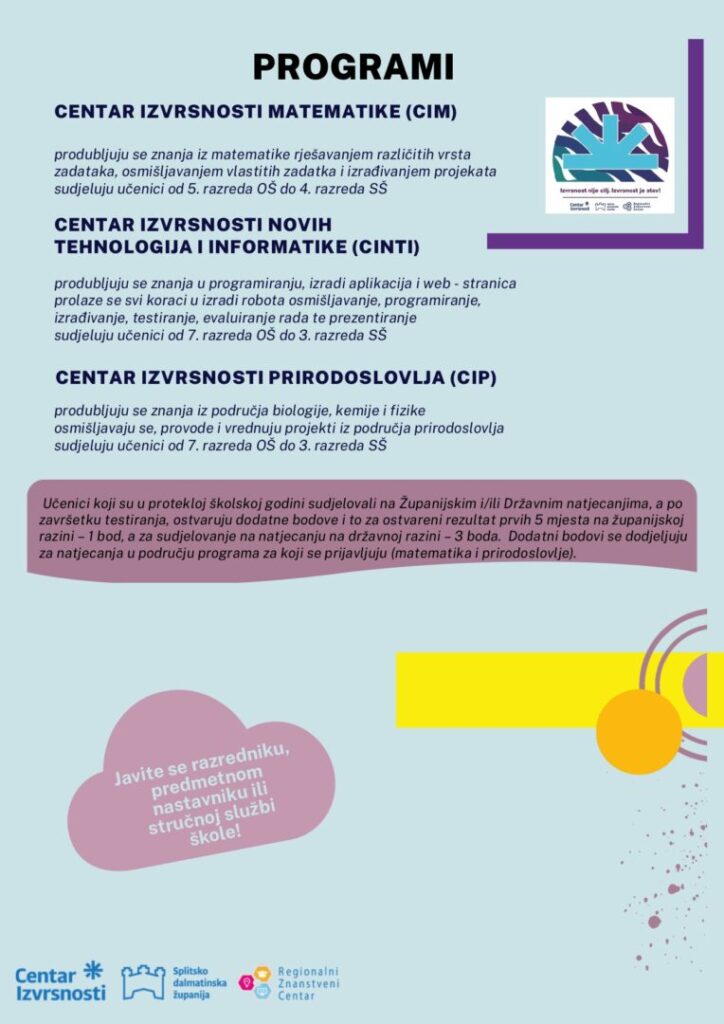 Centar izvrsnosti Splitsko-dalmatinske županije (u nastavku CI SDŽ) provodi javni poziv za stjecanje statusa polaznika u programima CI SDŽ čime omogućava visokomotiviranim i potencijalno darovitim učenicima sudjelovanje u aktivnostima unutar programa CI, koji su sljedeći: