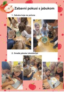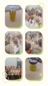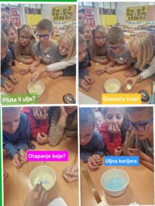 U učionici su poslušali priču o maslini, kroz koju su otkrili simboliku masline kao znaka mira, strpljivosti i života. Kroz pokuse sa maslinovim uljem, pokušali su istražiti kako i zašto se ulje odvaja od vode i zašto se ulje ne sjedinjuje s bojom. Uočili su i svojstvo ulja kao „štitnika“ od vode i gustoću slojeva različitih tvari. Ni matematika nije izostala – učenici su rješavali matematičke zadatke procjene količine ulja od ubranih maslina.