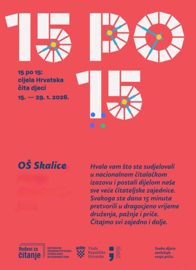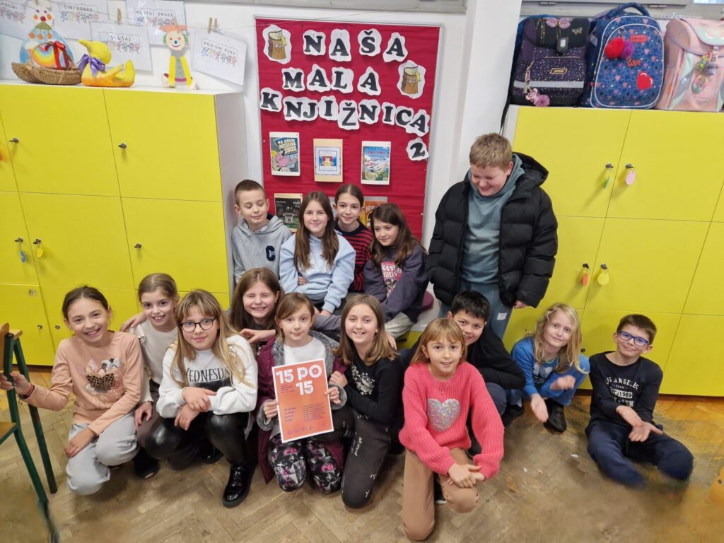 U siječnju ove godine učiteljice produženog boravka zajedno s učenicima 3.b, 4.b i 4.c razreda sudjelovale su u nacionalnom čitalačkom izazovu 15 po 15: cijela Hrvatska čita djeci. Ovaj izazov dio je programa Rođeni za čitanje, koji potiče zajedničko čitanje i stvaranje navike čitanja od najranije dobi.