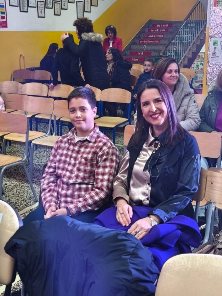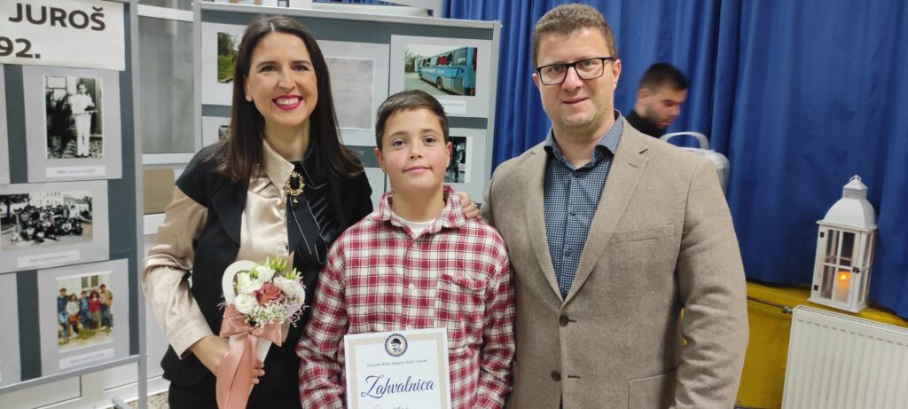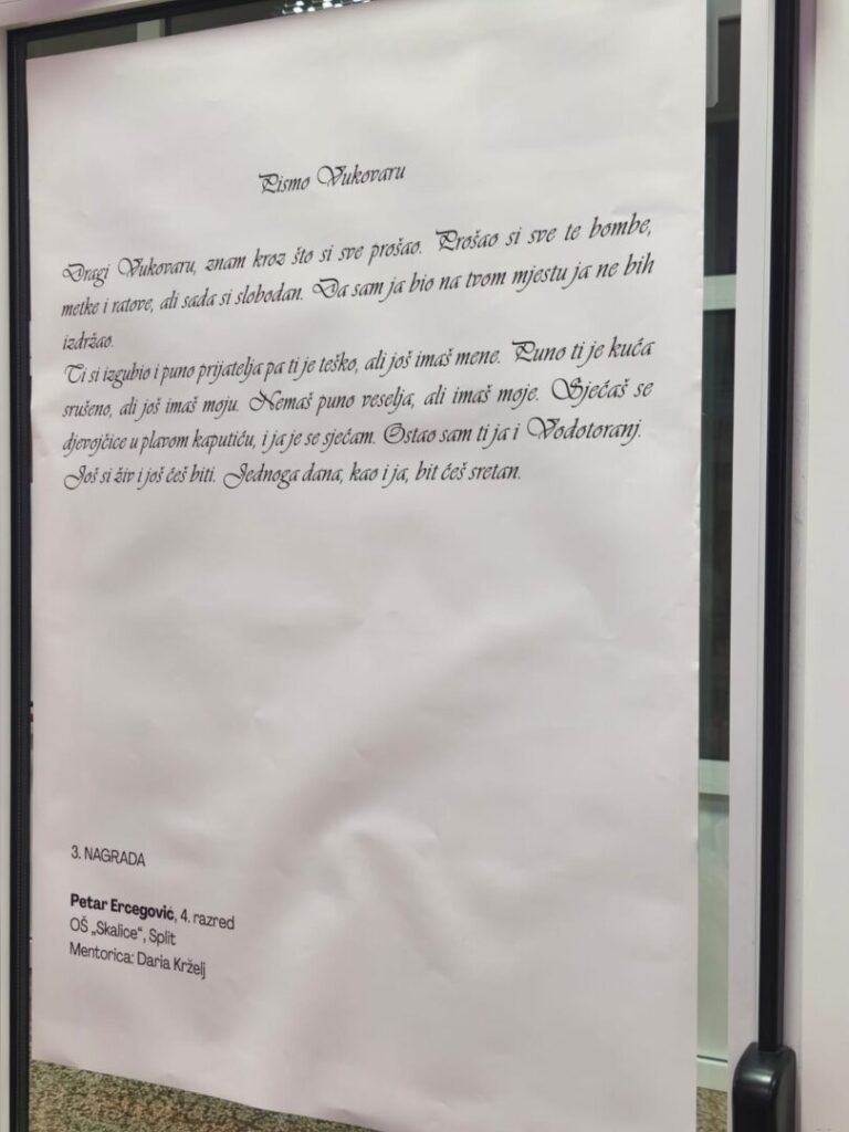 Među nagrađenima sjedio je i naš Petar Ercegović sa svojom mentoricom Darijom Krželj. Petar je za svoj literarni rad Pismo Vukovaru inspiriran mislima na Vukovar dobio treću nagradu u kategoriji 1. – 4. razreda te je s ponosom preuzeo svoju nagradu i zahvalnicu. Svečanom uručenju nagrada i zahvalnica nagrađenima i njihovim mentorima prethodio je svečani program u kojemu su sudjelovali školski pjevački zbor te dramska družina koja je publiku ganula potresnim igrokazom. Nagrađenima je čestitao i ravnatelj škole domaćina te gradonačelnik Imotskoga.